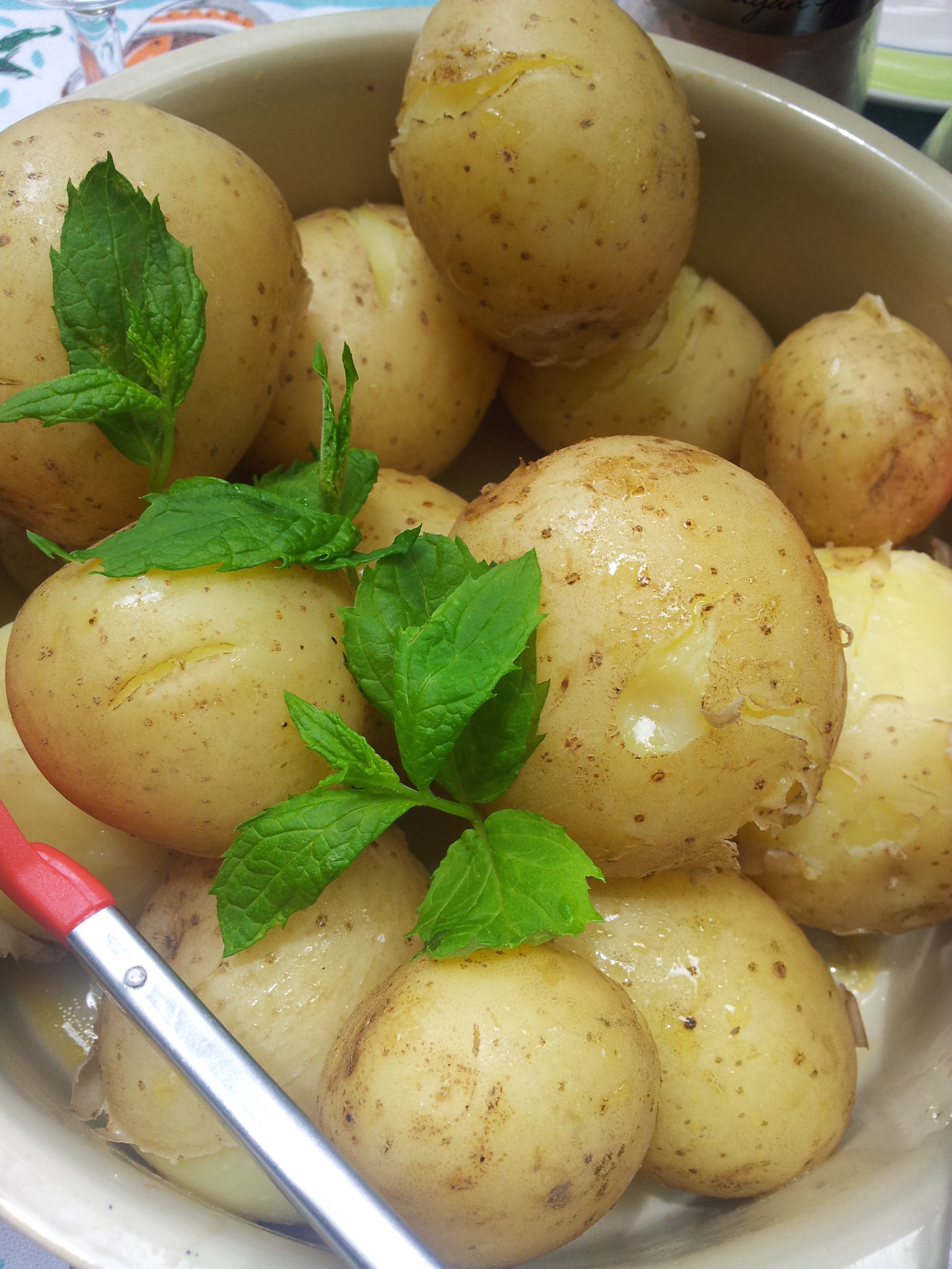New potatoes if really fresh are best simply prepared and presented. Gently boil with a sprig of mint and salt until tender and then for serving add butter or olive oil drizzled over them and a fresh sprig or two of mint for decoration. My friend Heather from Whangarei Heads recently presented her freshly dug new potatoes with the delicious addition of finely chopped preserved lemon and chopped parsley.