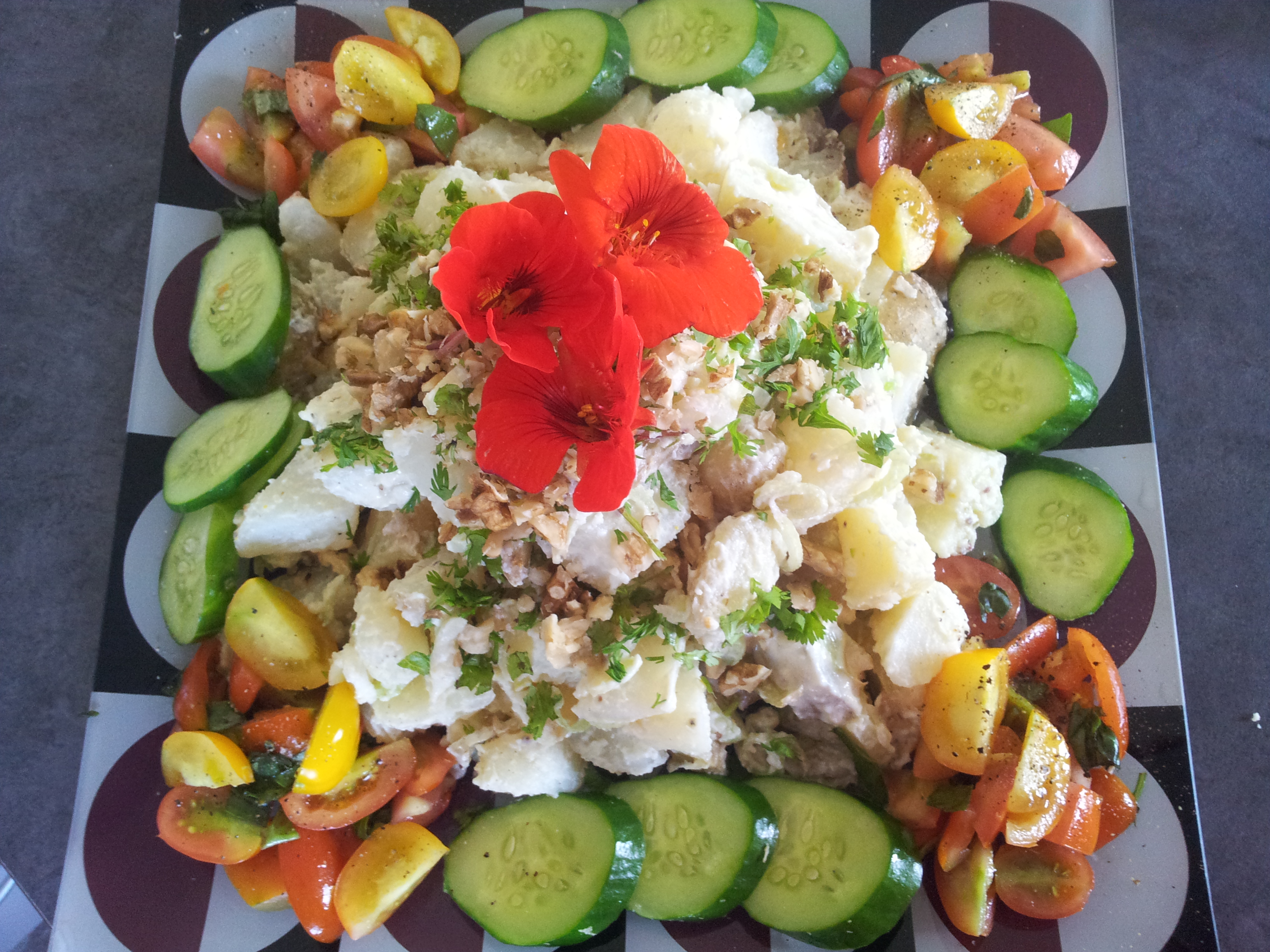 The trouble I have with potato salad is that it’s such a boring unappetising colour so I decided to make a potato salad mountain and decorate it with other salad vegetables for a recent family barbecue.