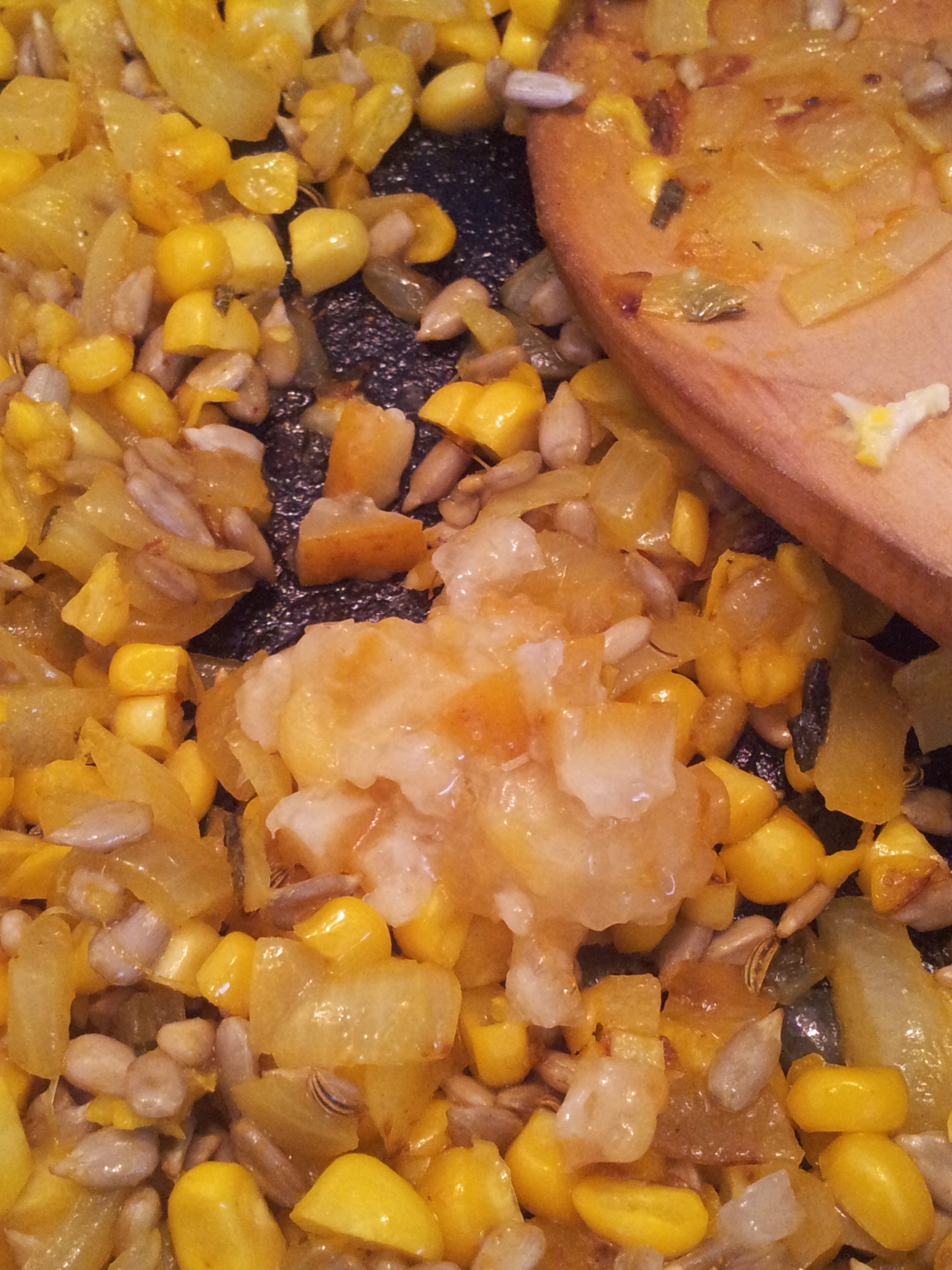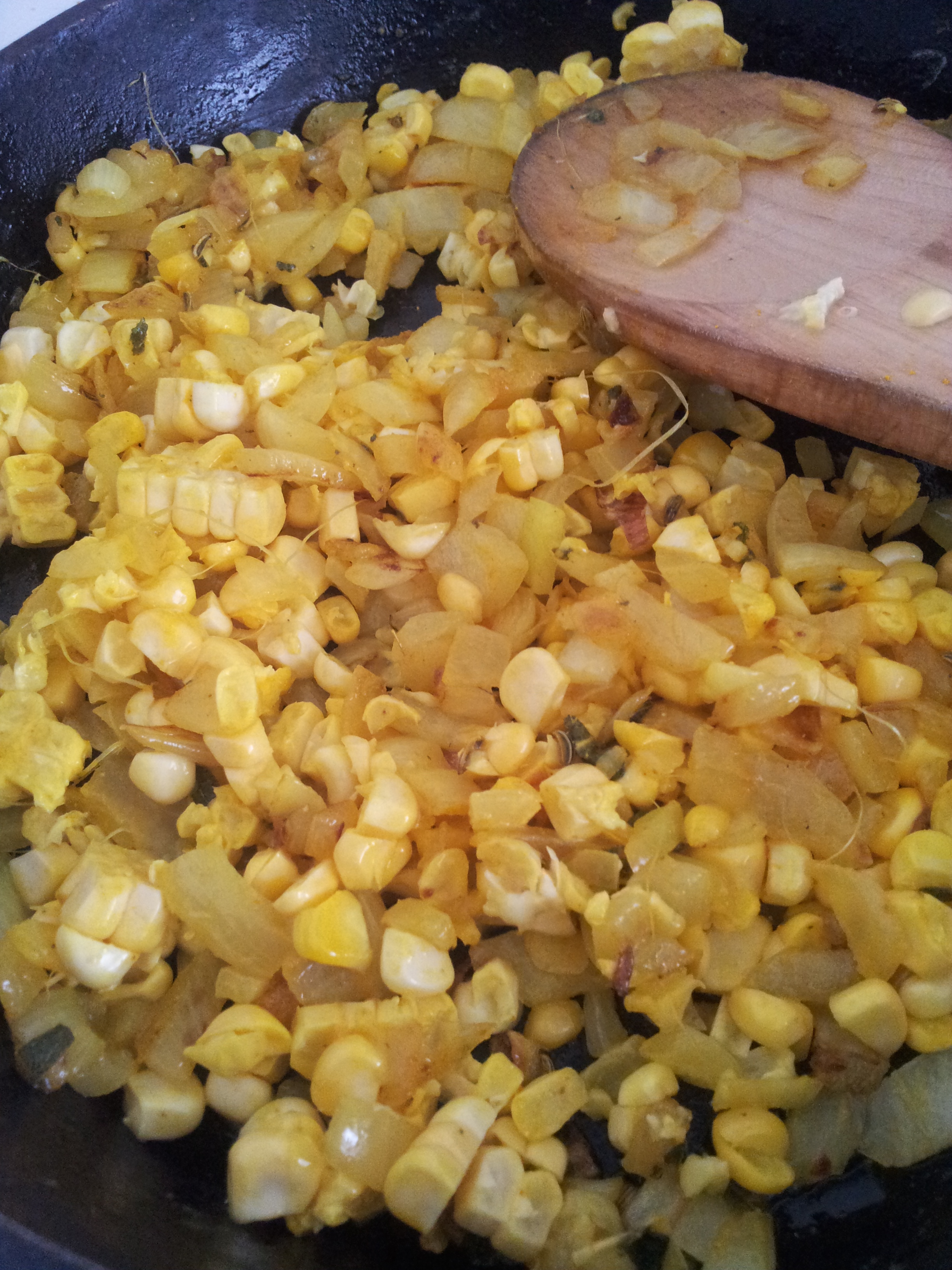 I had one corn cob left and knew this would make my scallopini attractive to Beau who loves corn. I cut the cobs from the uncooked cobs by sliding a knife down where the corn meets the husk. There were quite a few stringy fibres that I plucked out before adding to the spiced onion mix. Instead of corn you could use red peppers and a chilli if you want to add some heat.