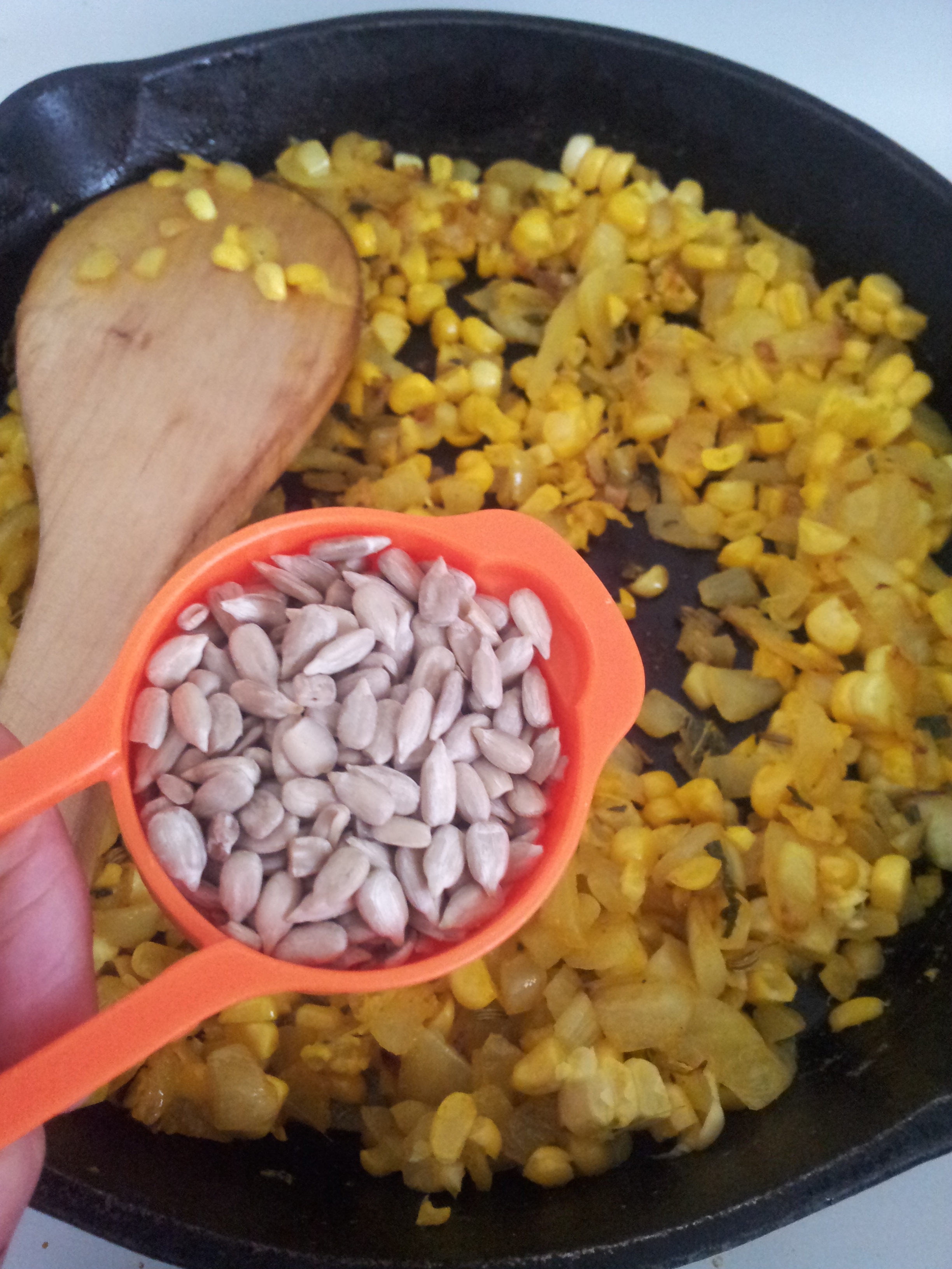 Next I thought about adding some nuts. Almonds would be a delicious addition but on this occasion I use seeds – 1/4 cup of sunflower seeds in recognition of the great display we have of sunflowers at our gardens.
