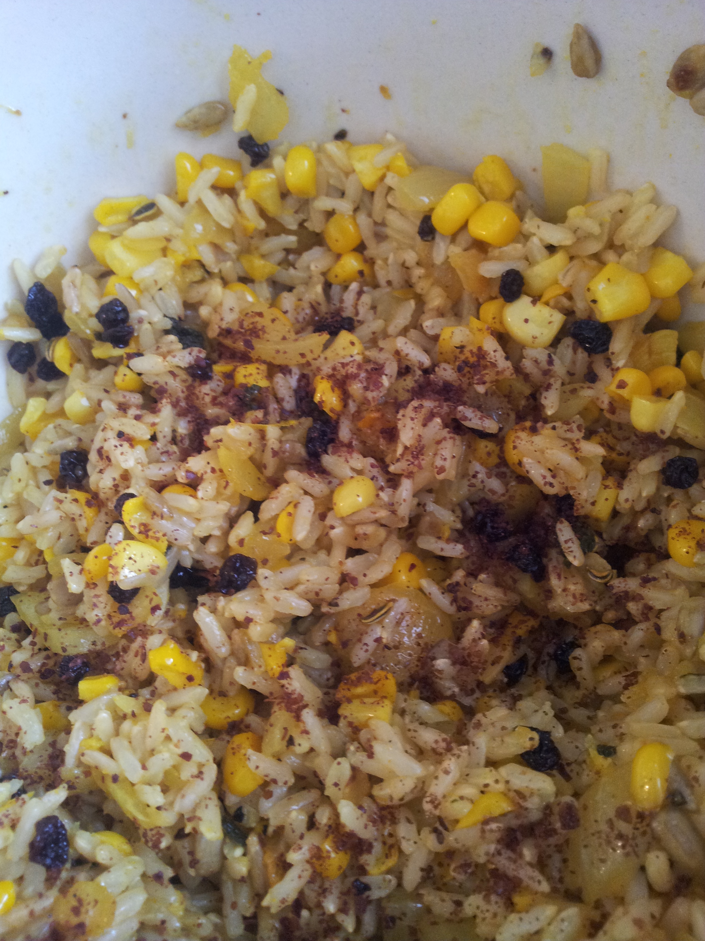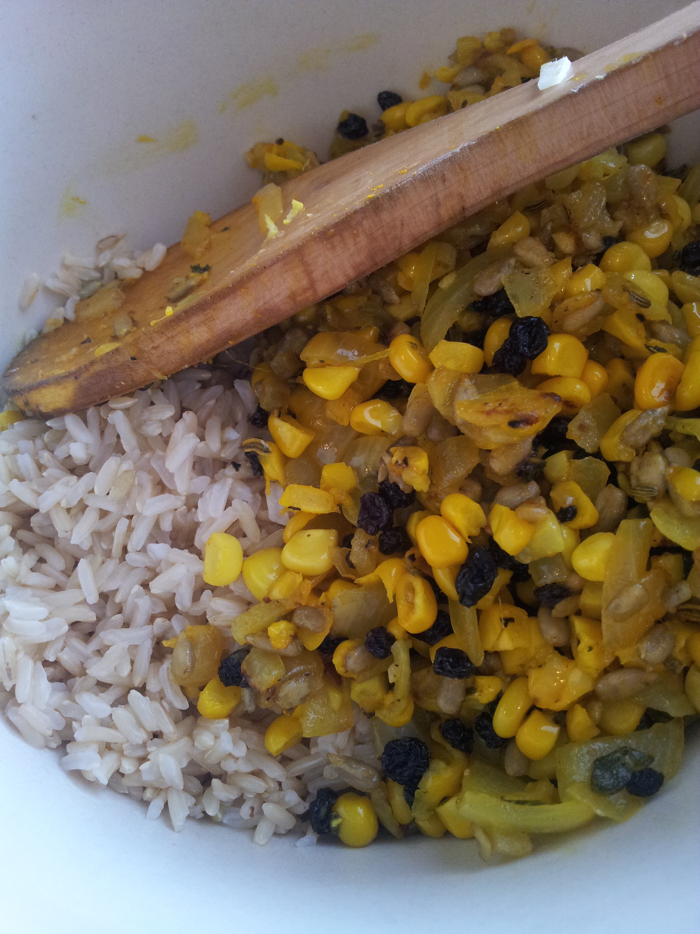 I mixed the drained cooked brown rice with the spiced onion and corn mix, and had a taste. It was delicious but I felt it just needed one more spice.