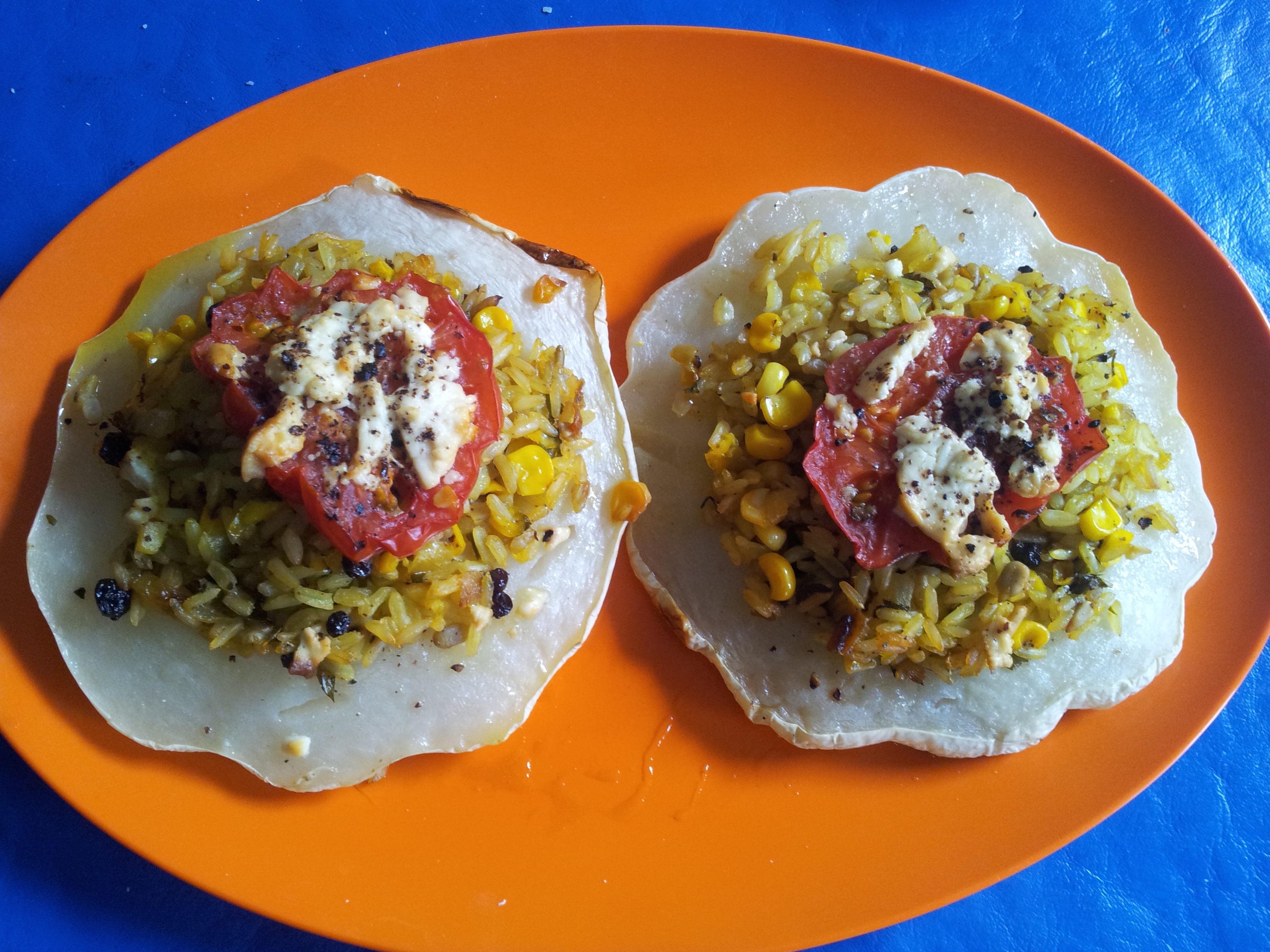 I had brown rice, corn, preserved lemon and a couple of Italian heritage tomatoes from the gardens.