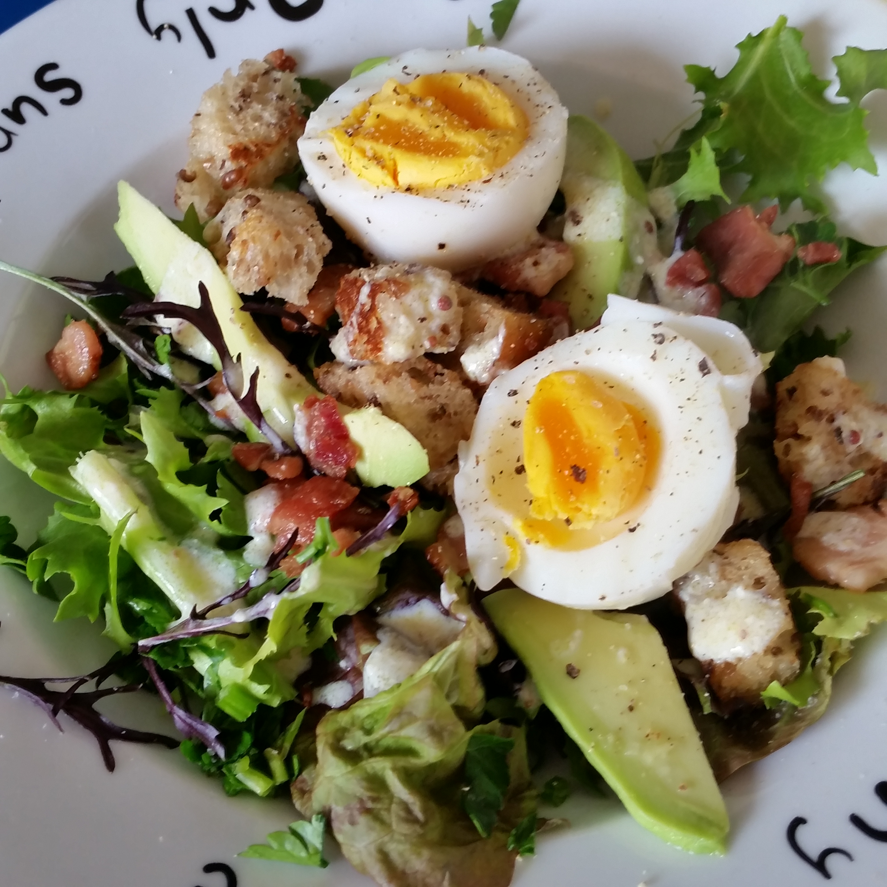 Curly endive makes up the majority of this salad with an egg, avocado, bacon, some mizuna “red coral” and croutons. A great lunch salad.