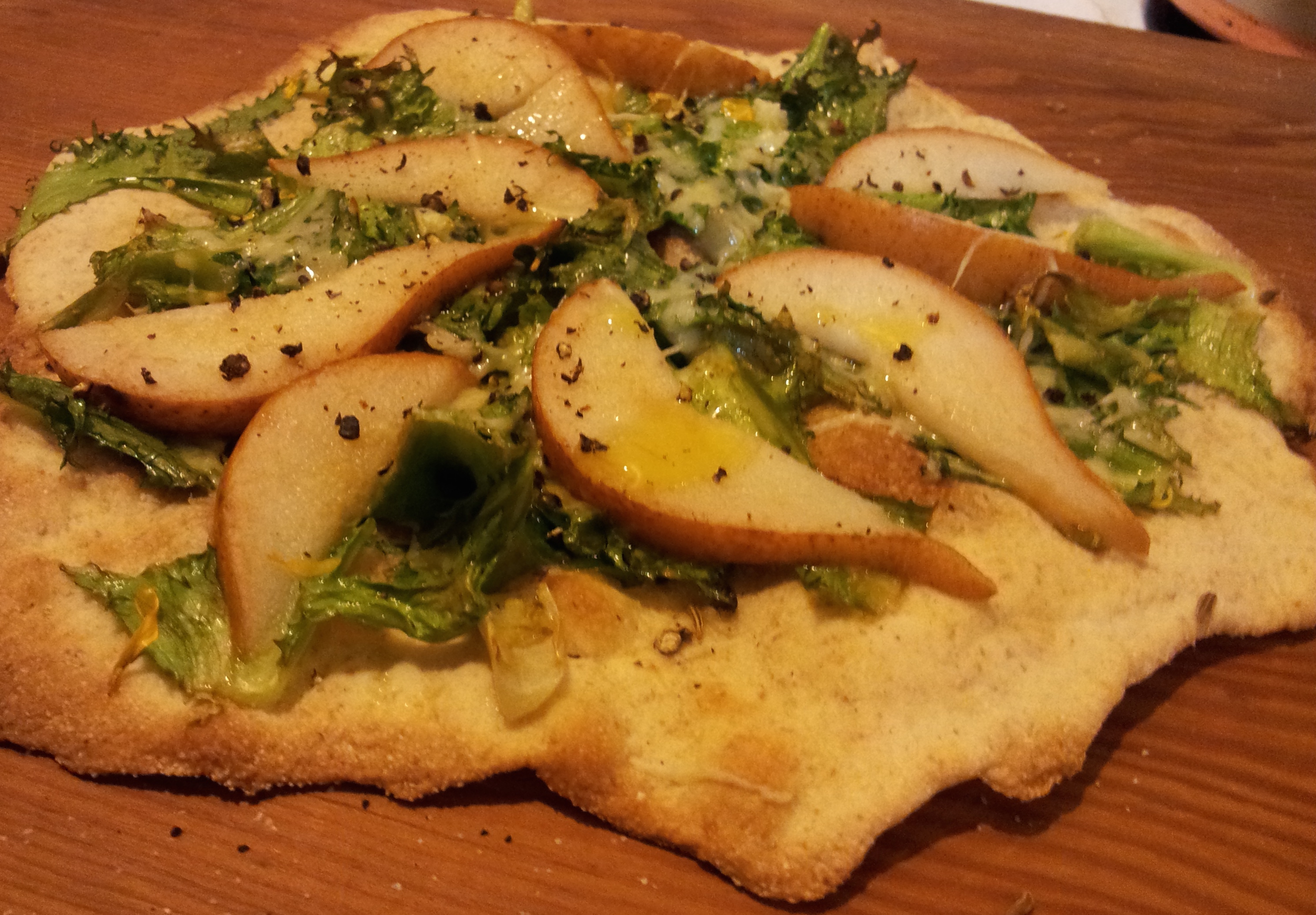 Pizza de la endibia with sliced pears, parmesan and pepper.