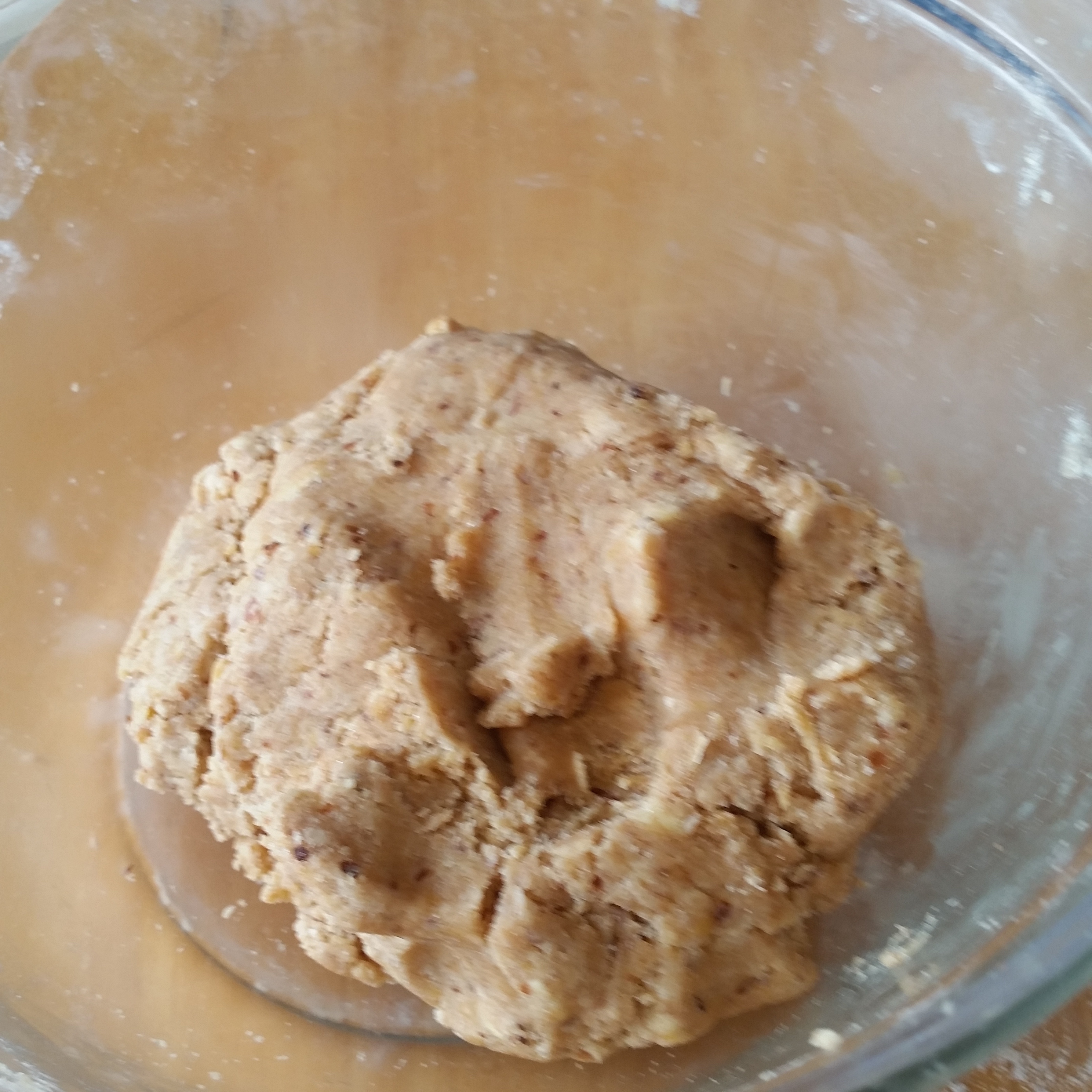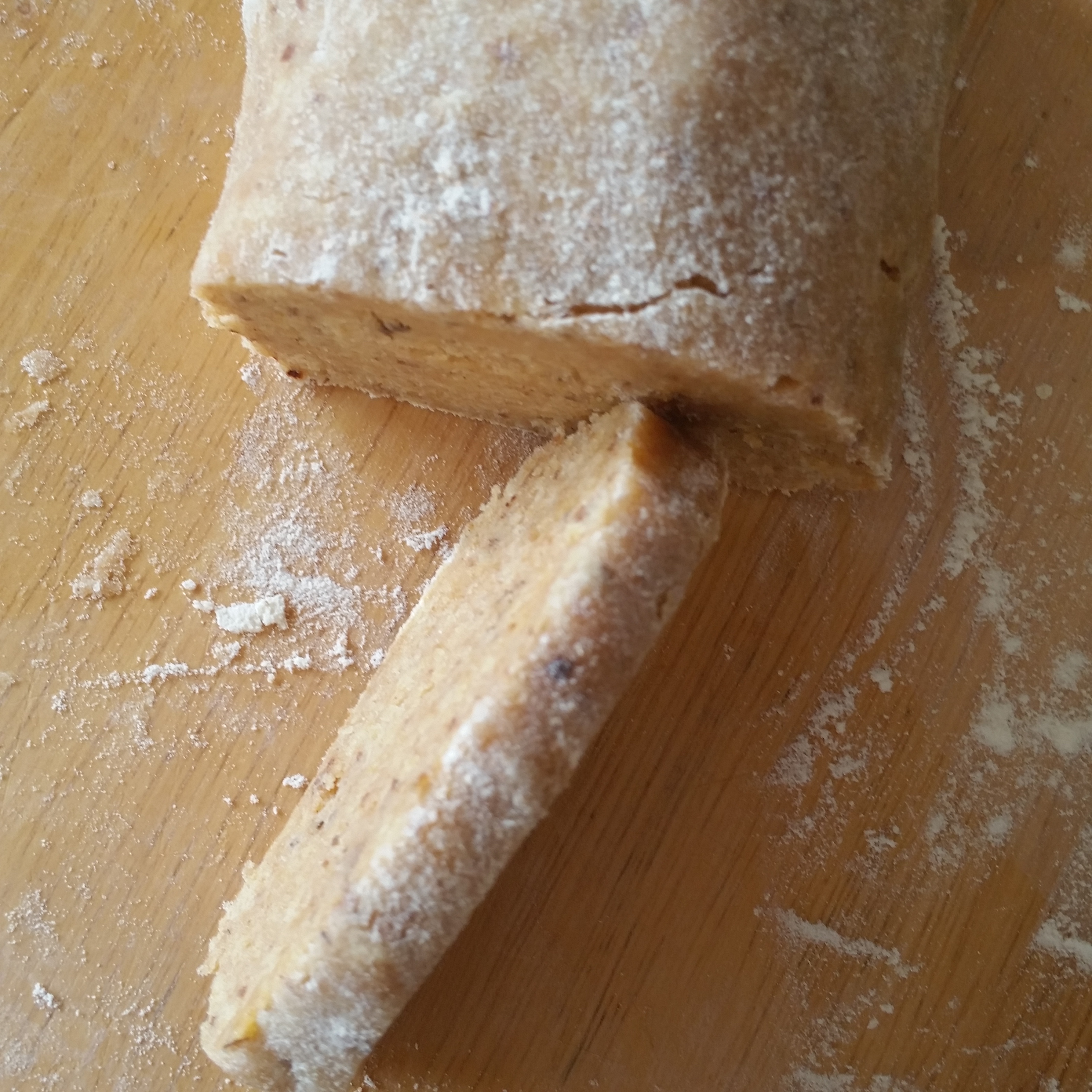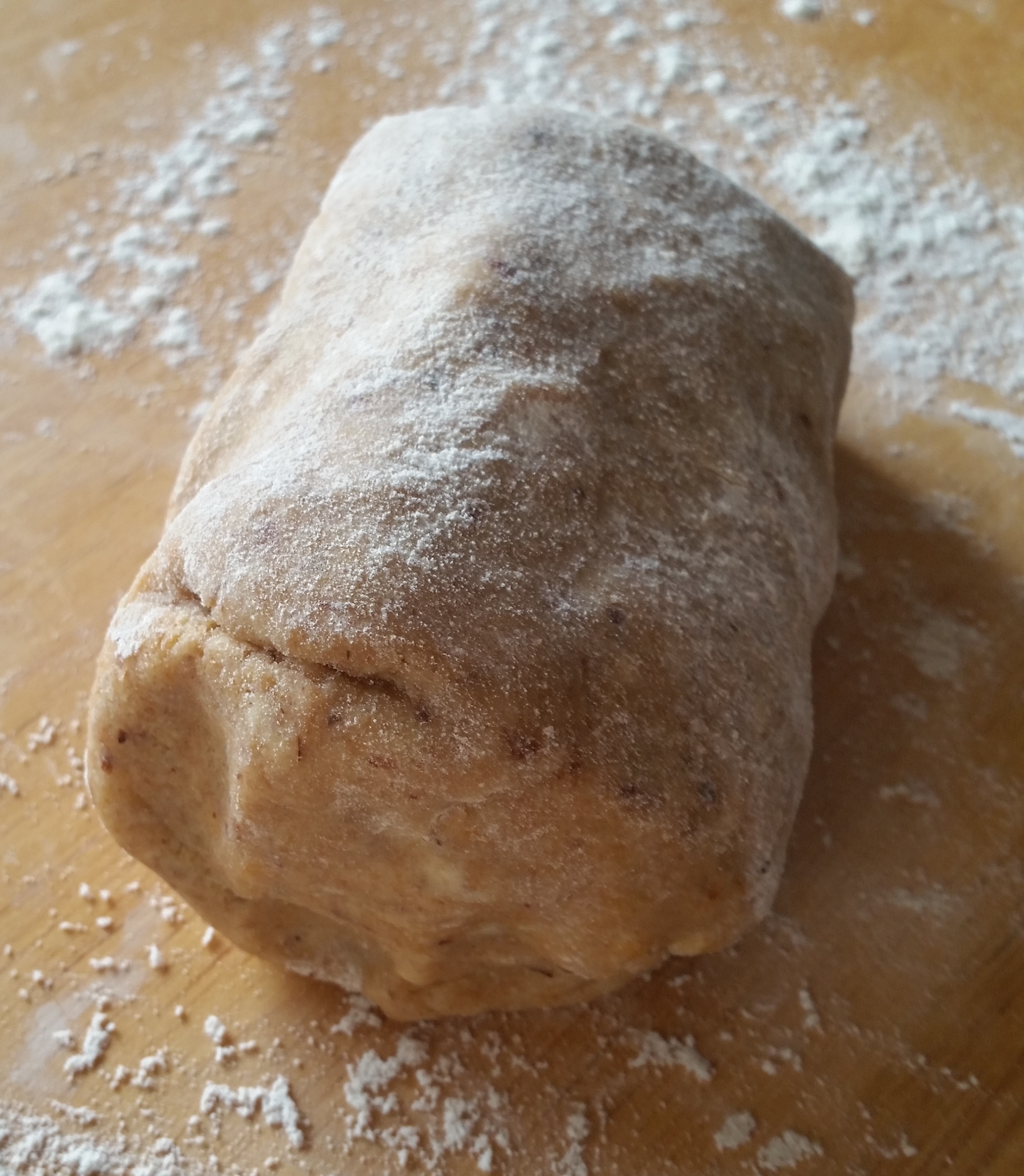 Gently with your hands roll the dough into a short, thick sausage, This recipe is from Nigel Slater and he suggests this techmique rather than rolling out into one big piece because rolling out can be difficult and this simple method limits the handling time.