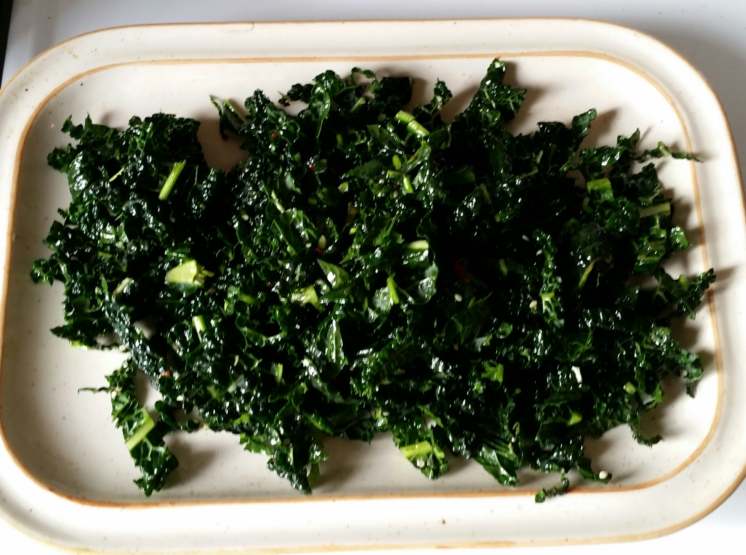 I ended up with kale chips only with more flavour. It looked better before cooking than after but I enjoyed the crispy chips on top and the slightly more chewy bits underneath. I also sprinkled in a little seaweed seasoning and this taste of the sea would be great with fish.