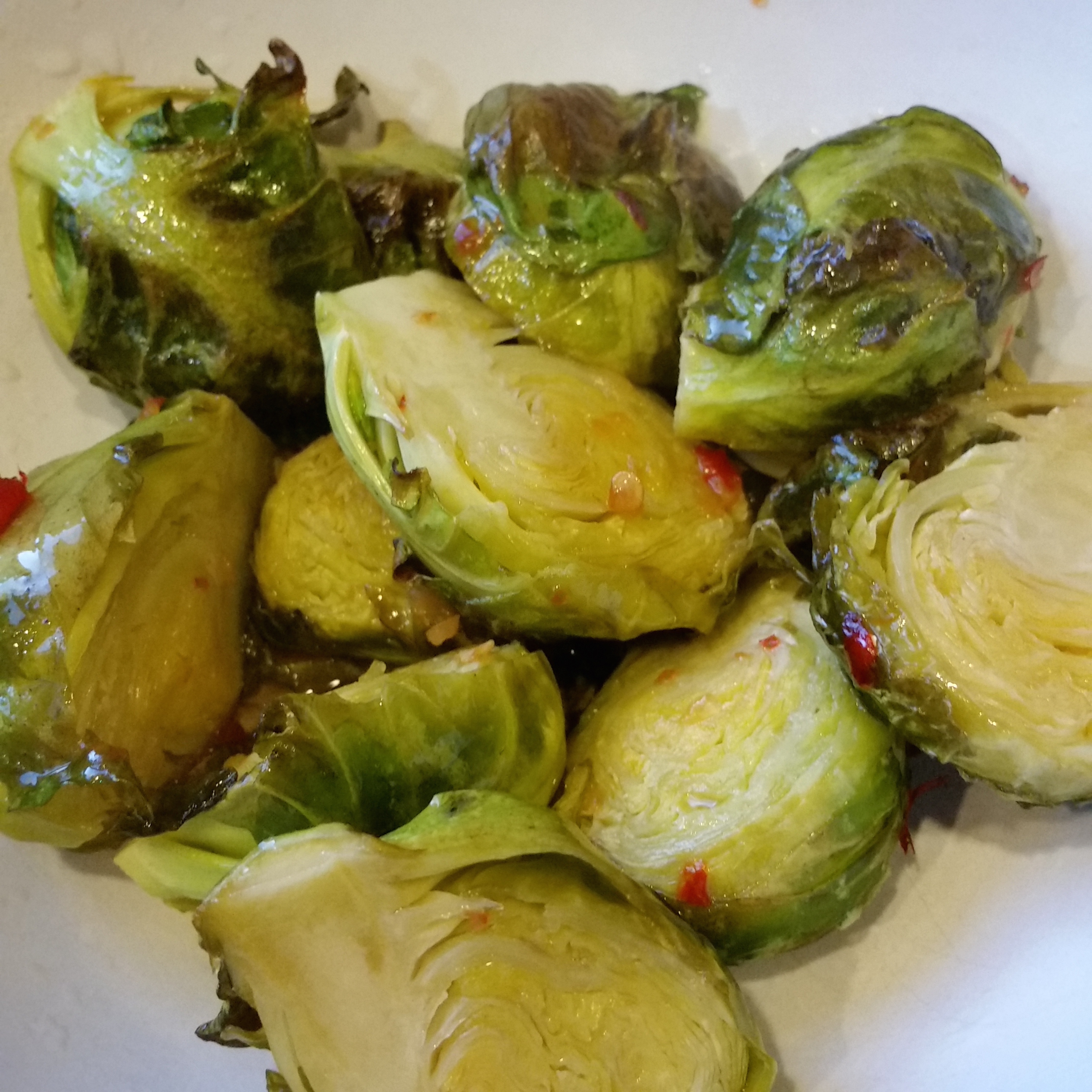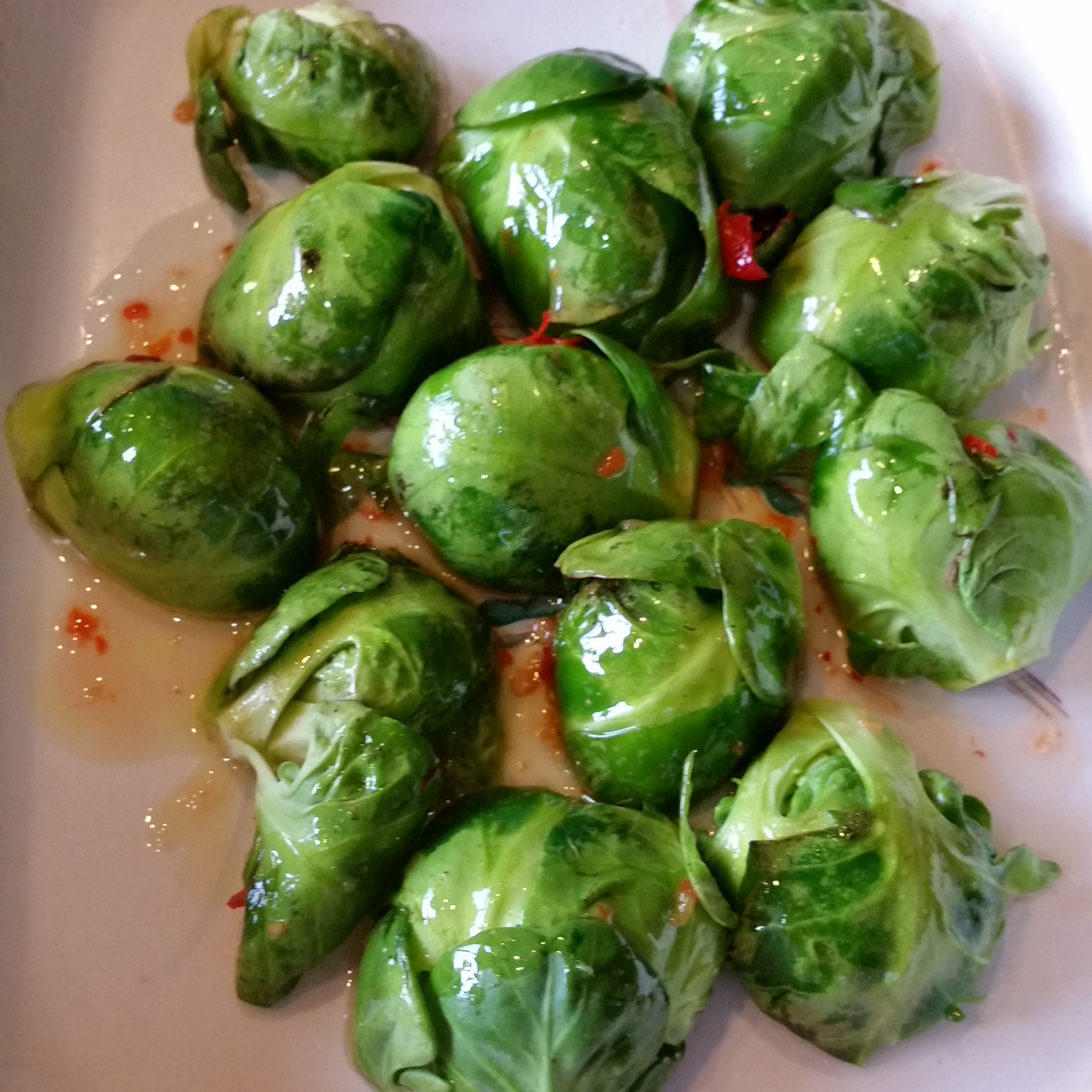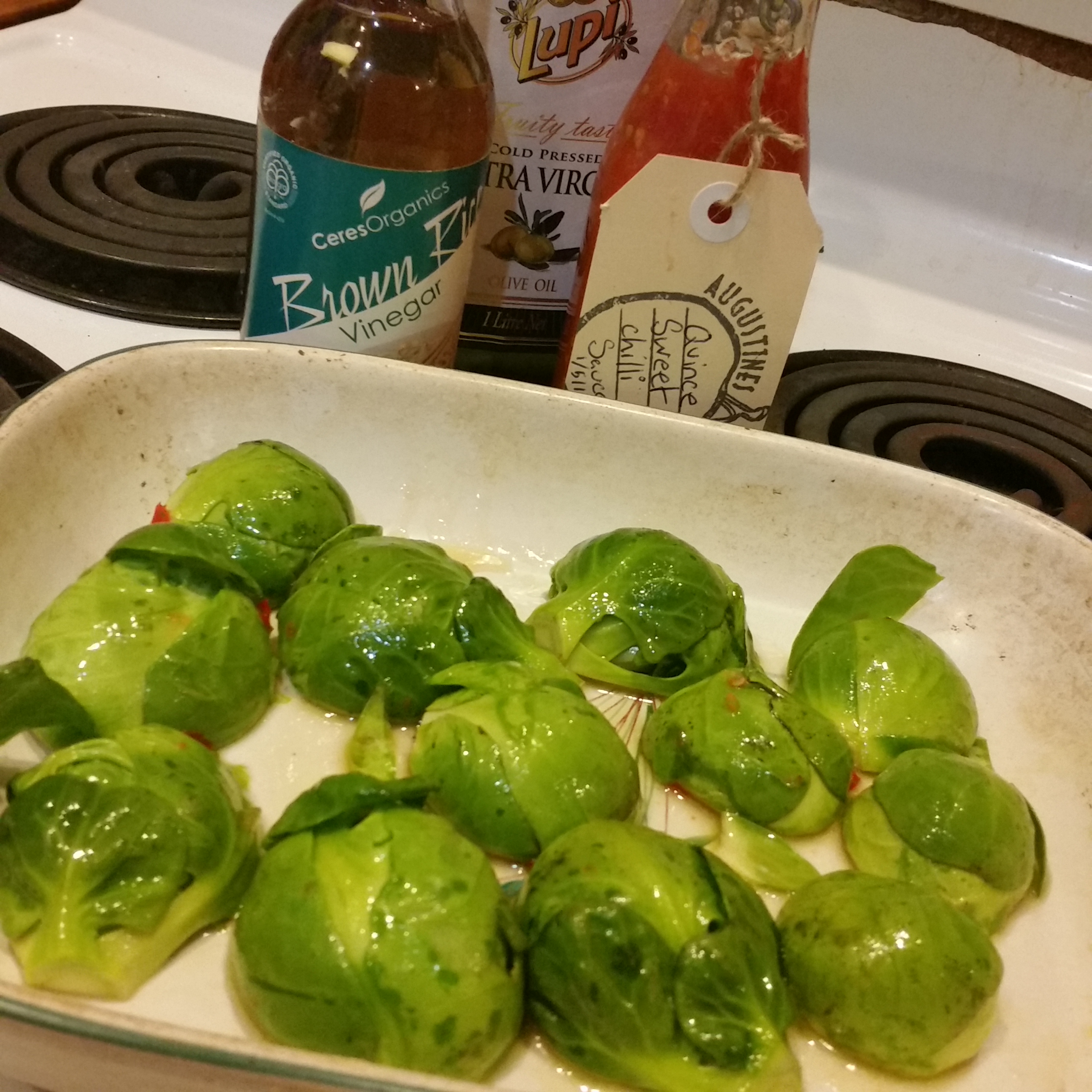 750g Brussels sprouts, ½ cup olive oil (or a mix of olive and rice bran oil), ¼ cup of brown rice vinegar (you can replace this with apple cider vinegar), 1 tbsp of honey, 2 tsp of chilli sauce (or to taste).