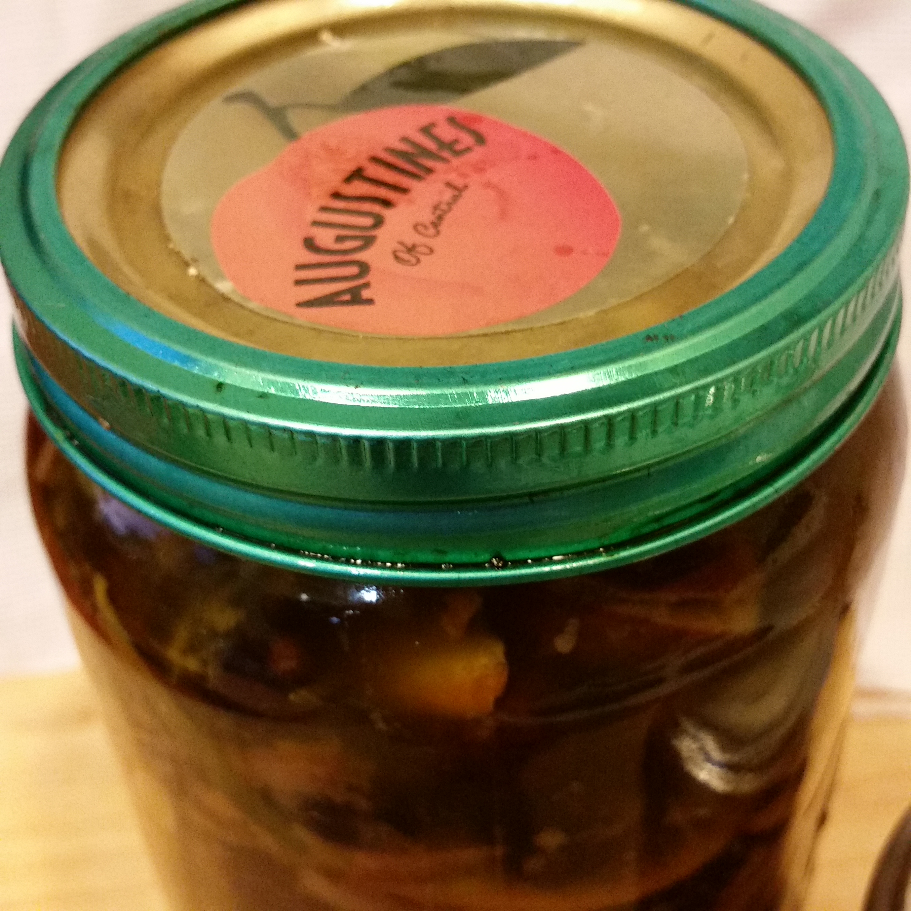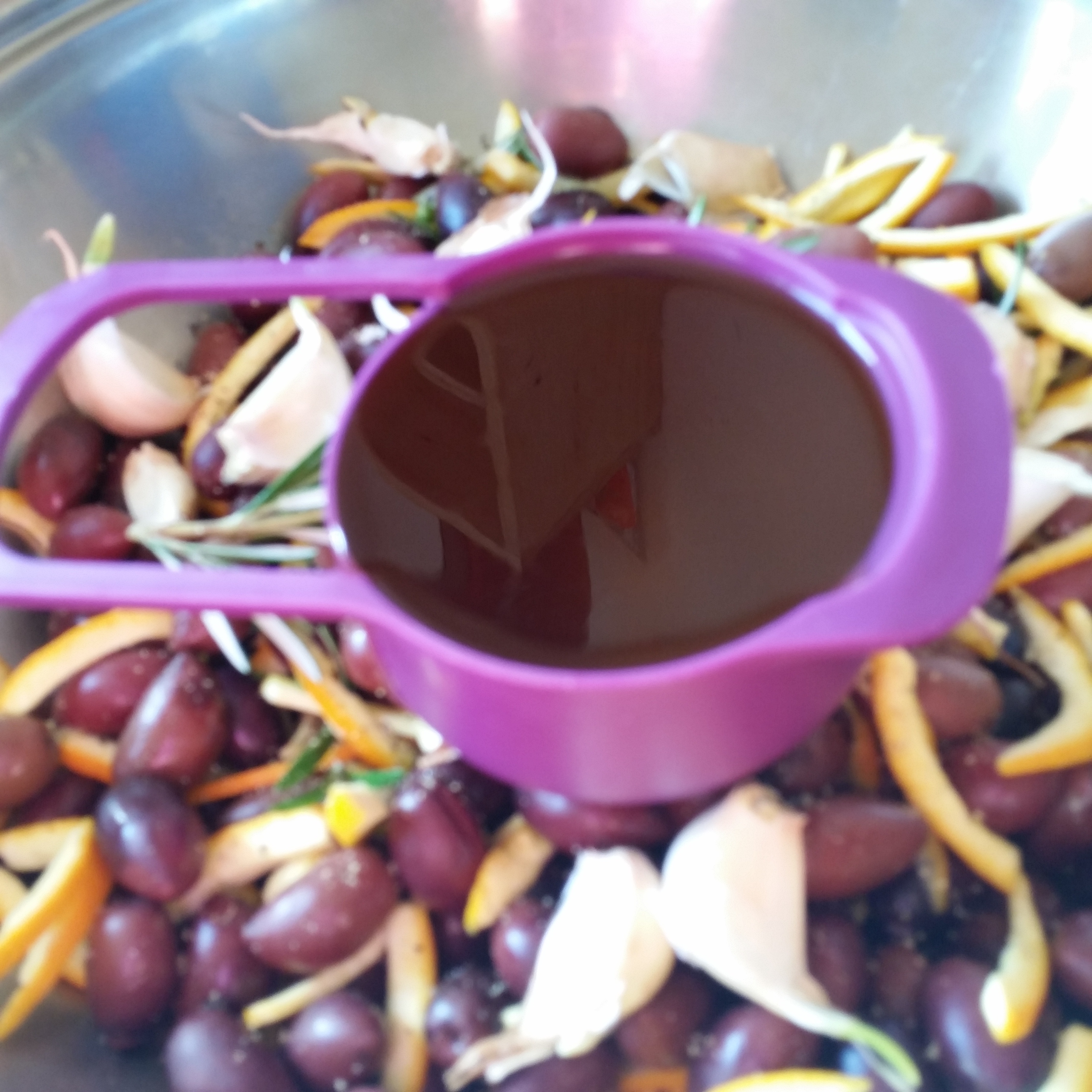 As I chose larger kalamata olives it took about an hour and they still weren’t wrinkled, but the orange and garlic was certainly soft so it was time for bottling.