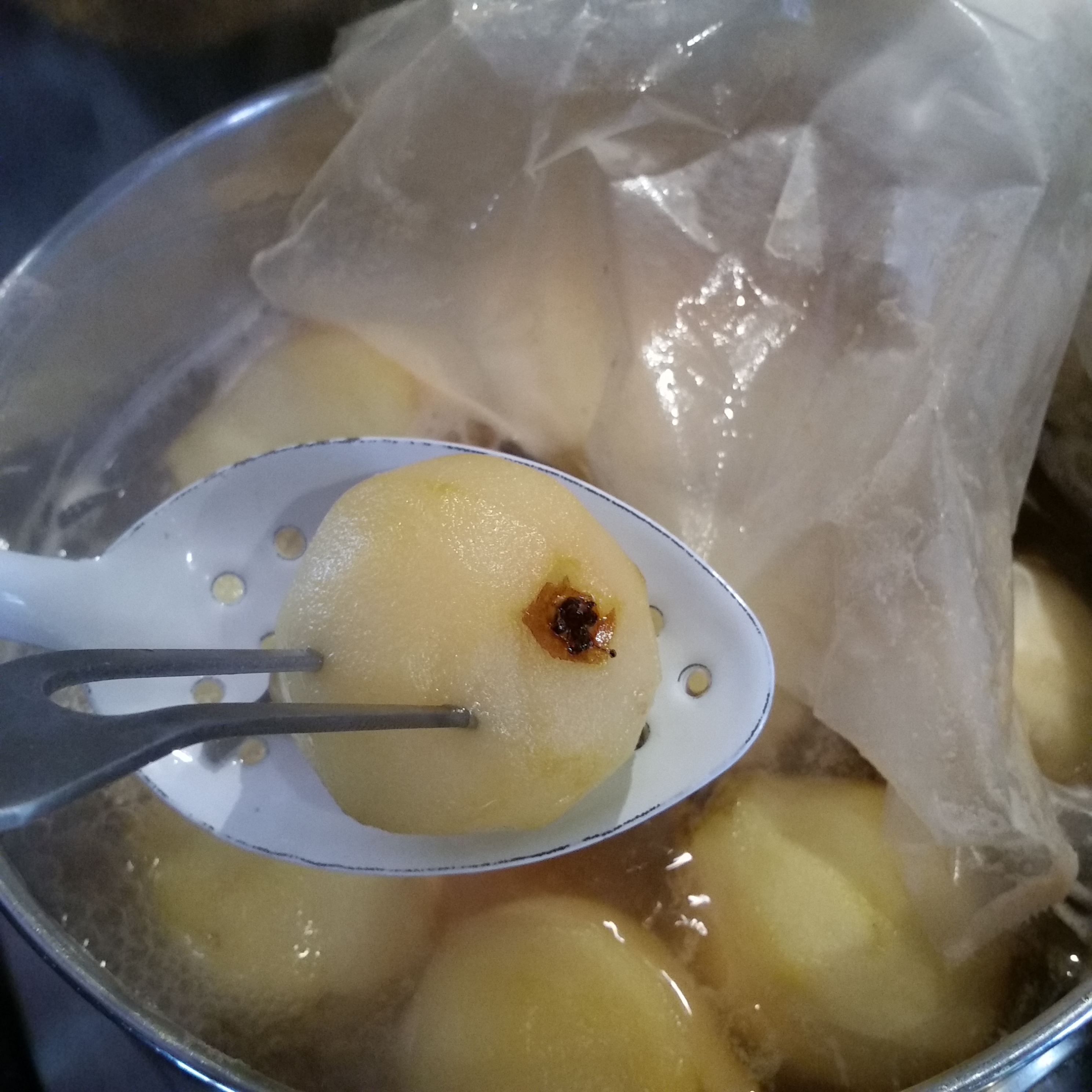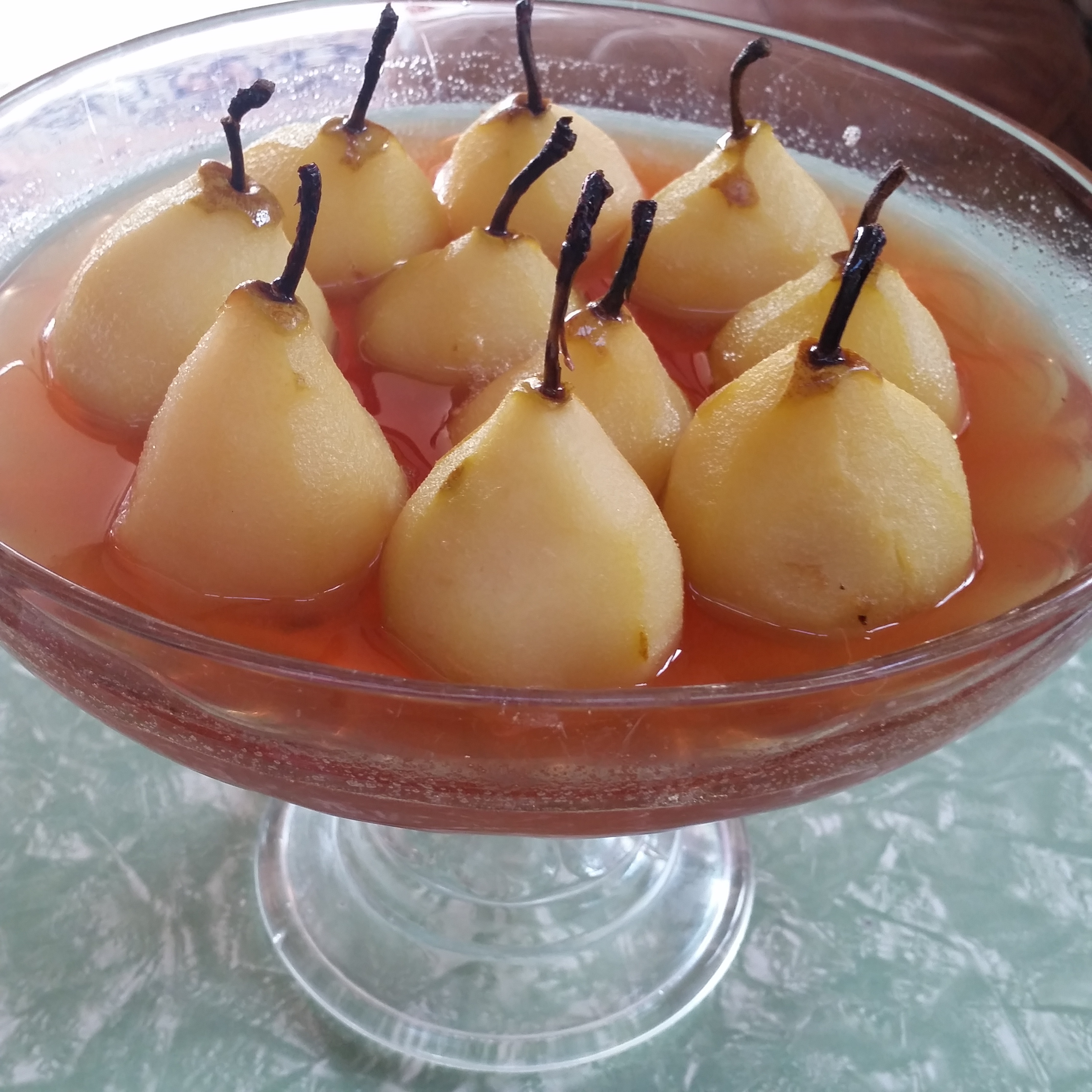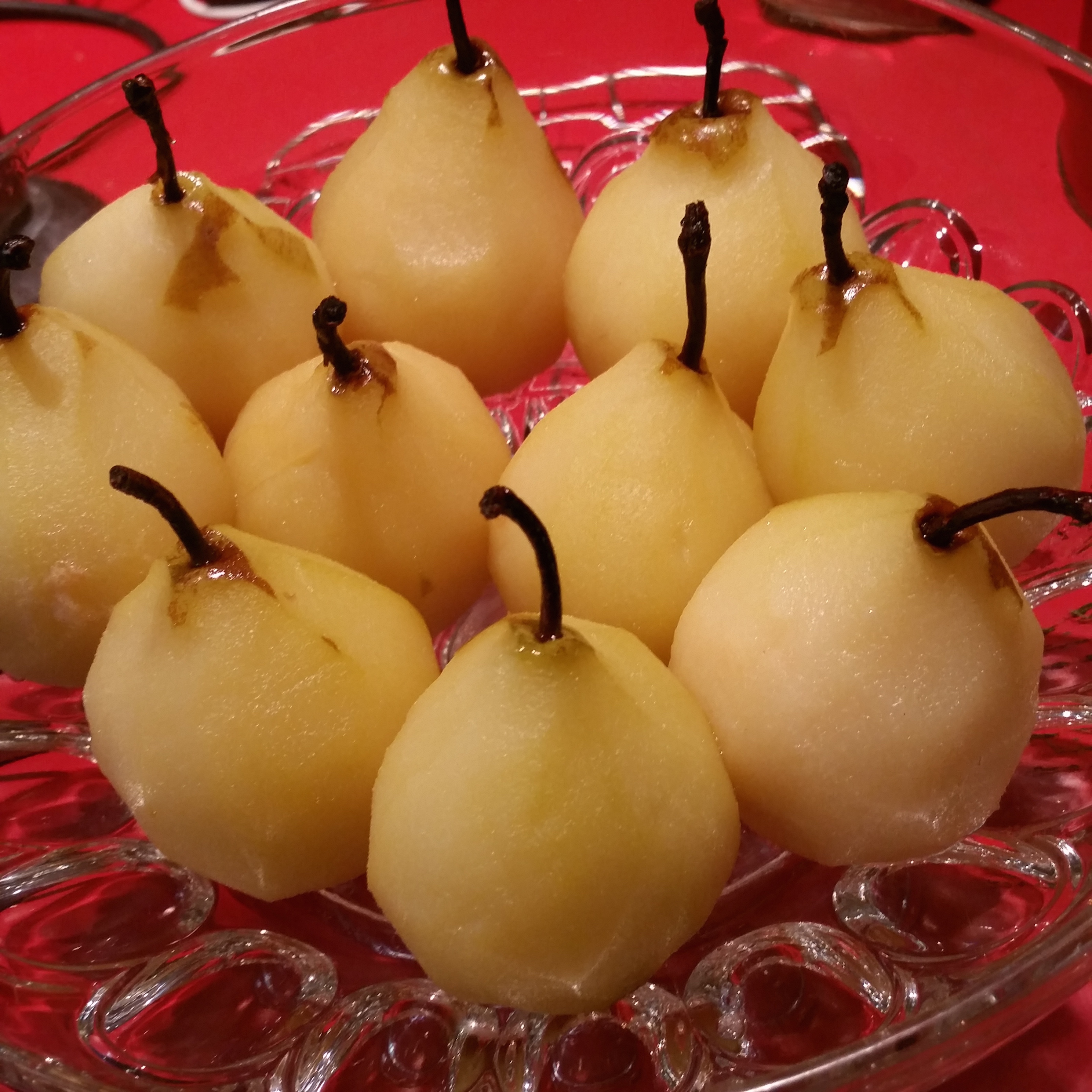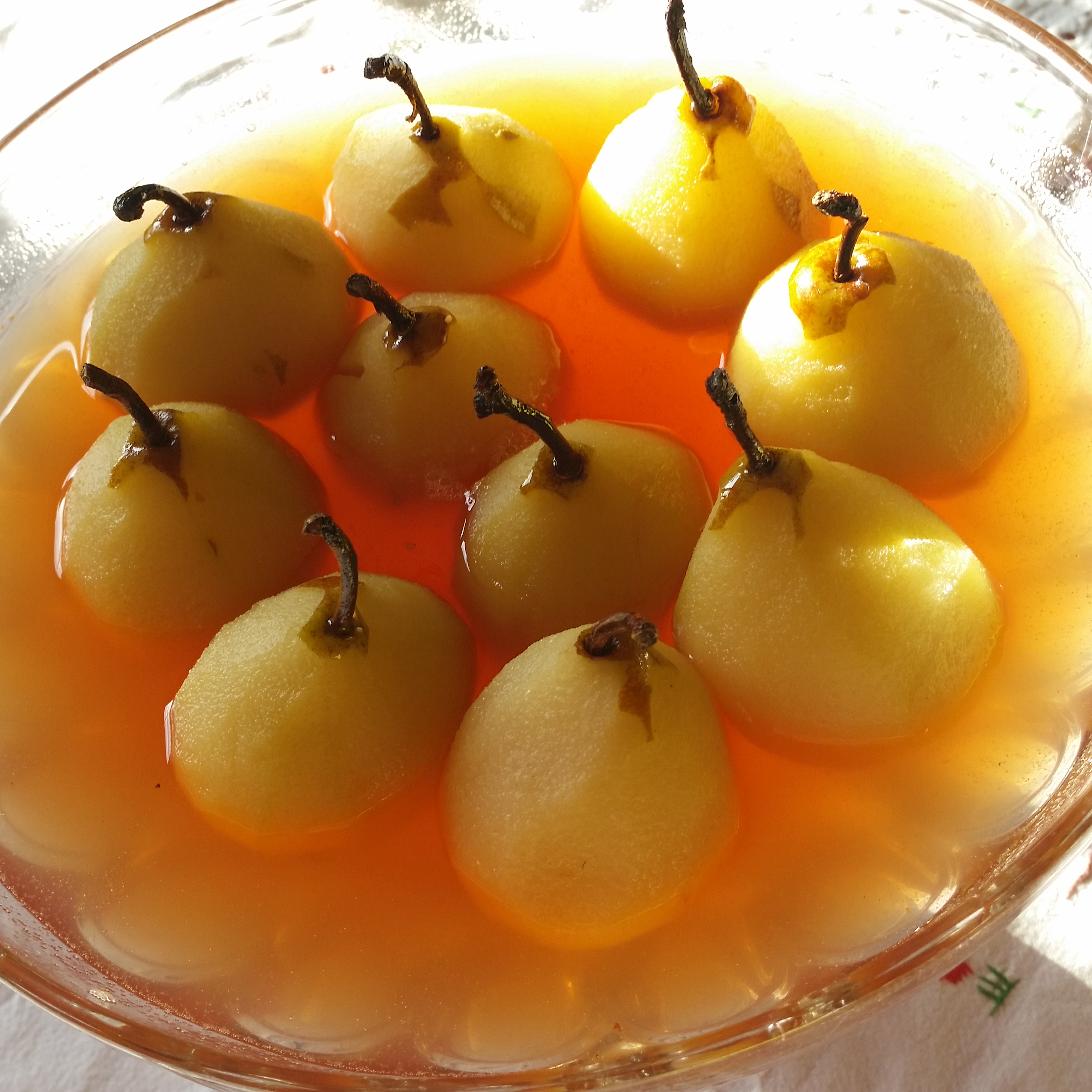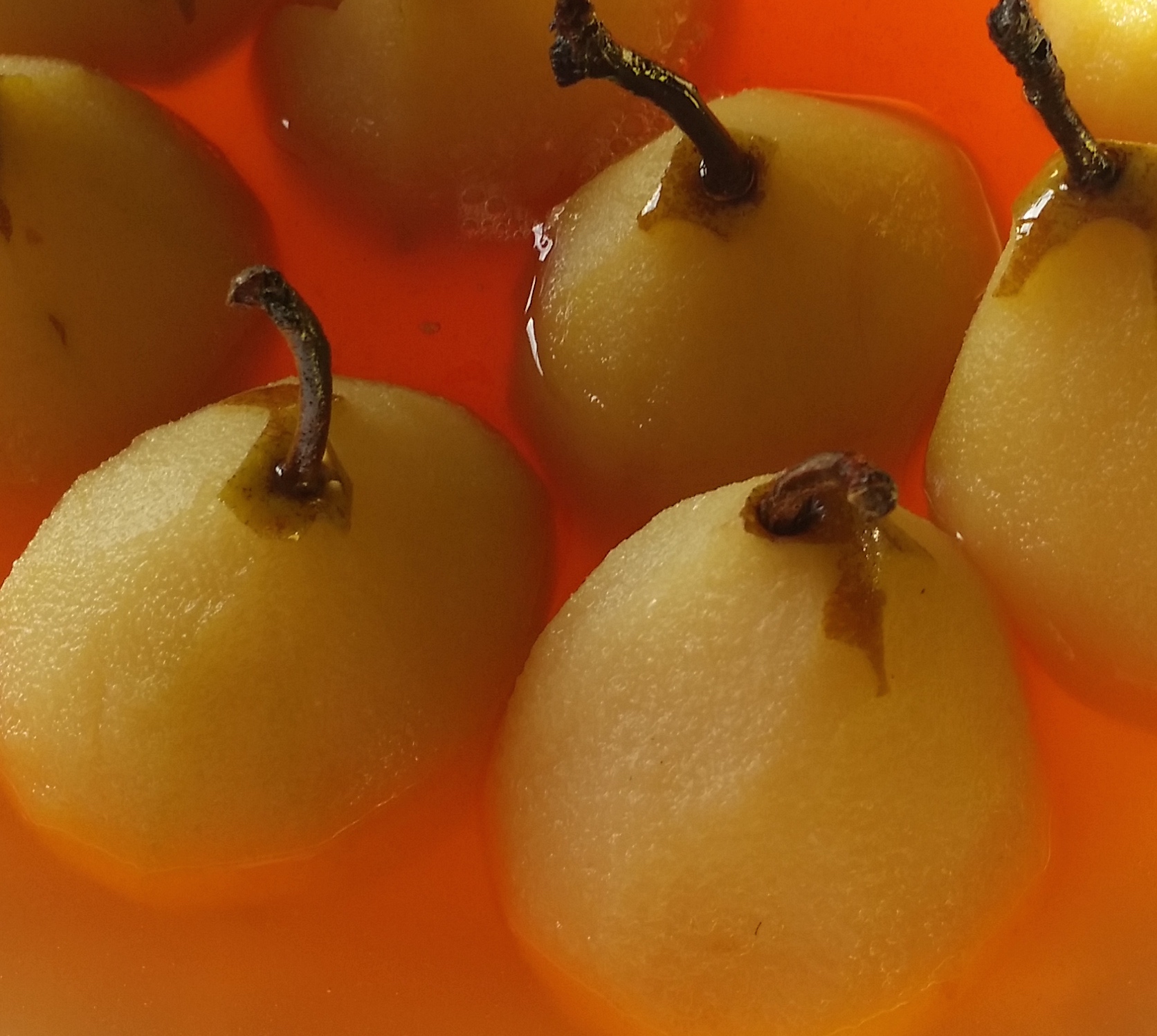 Juice of a lemon – first to cover freshly peeled pears to stop browning and then remainder added to poaching liquid