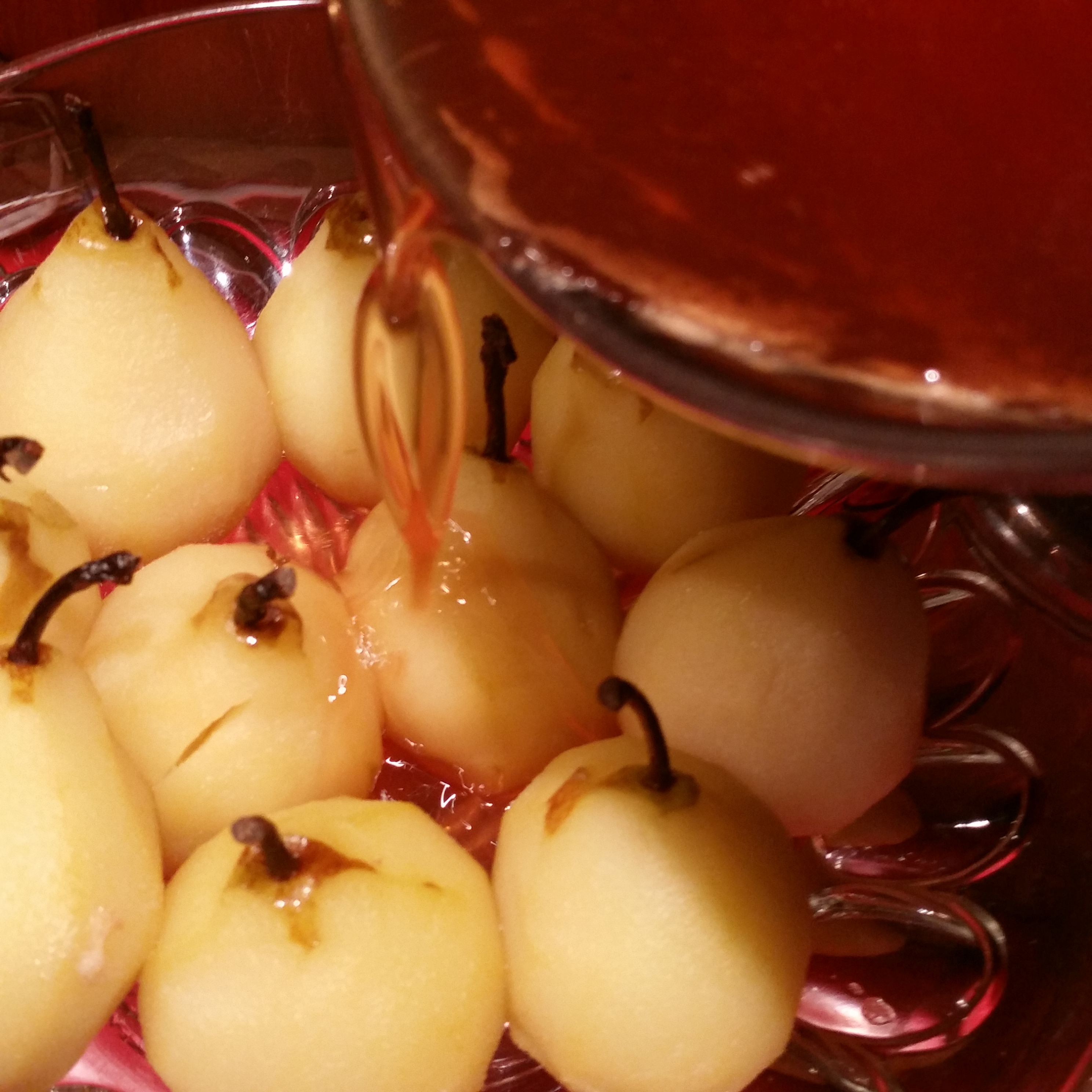 If you don’t weigh down the pears they will naturally bob up to the top and their tops could discolour.
