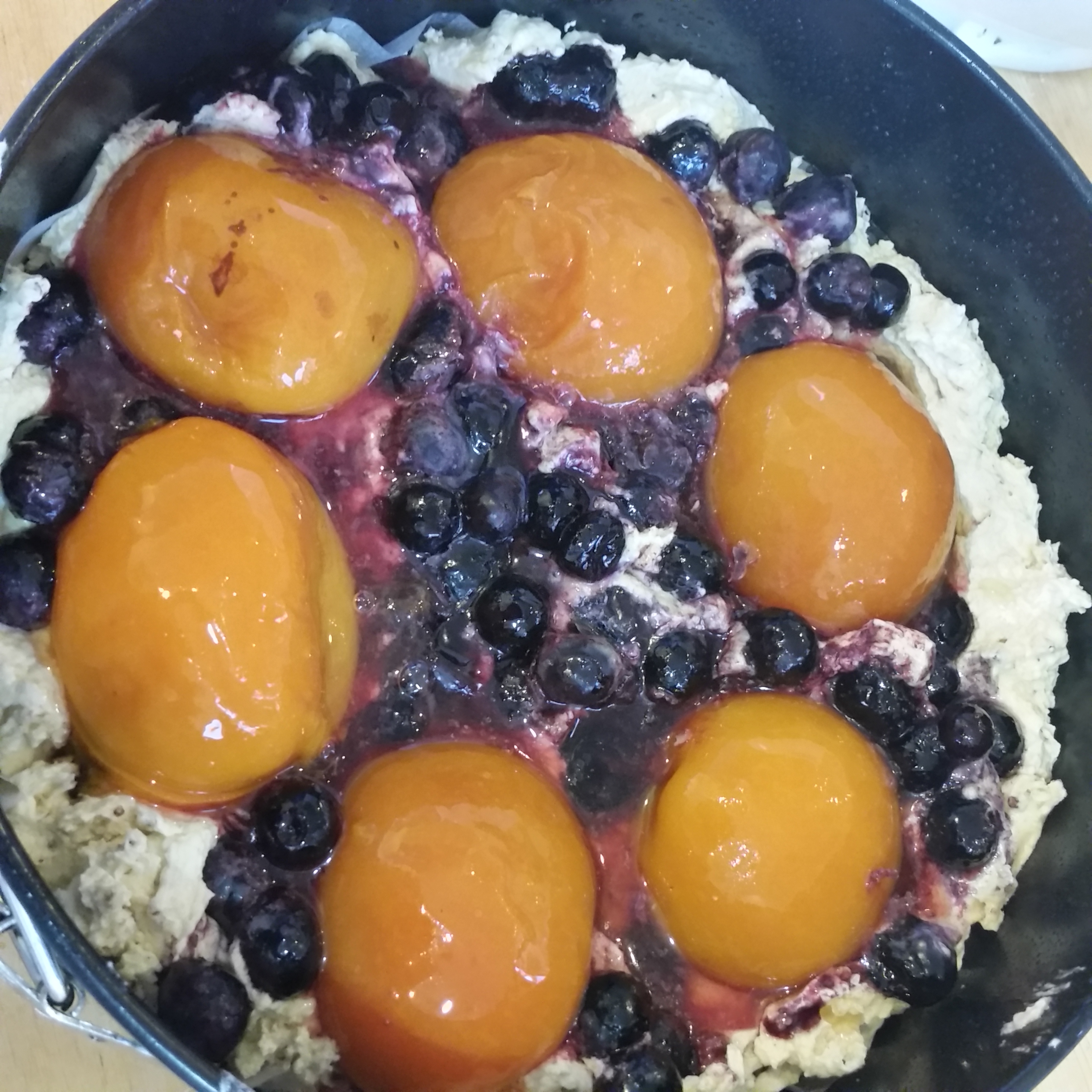 My first experimentation with the Almond Pudding Cake recipe was to use Gus’s suggested combination of blueberries and his apricots. I liked this idea for three reasons. First, using two summer fruits preserved in time, one quick frozen and the other in a preserving jar. Second, using fruits from two ends of New Zealand – north of Auckland for the blueberries and Central Otago for the apricots. Thirdly, the colour combination is gorgeous.
