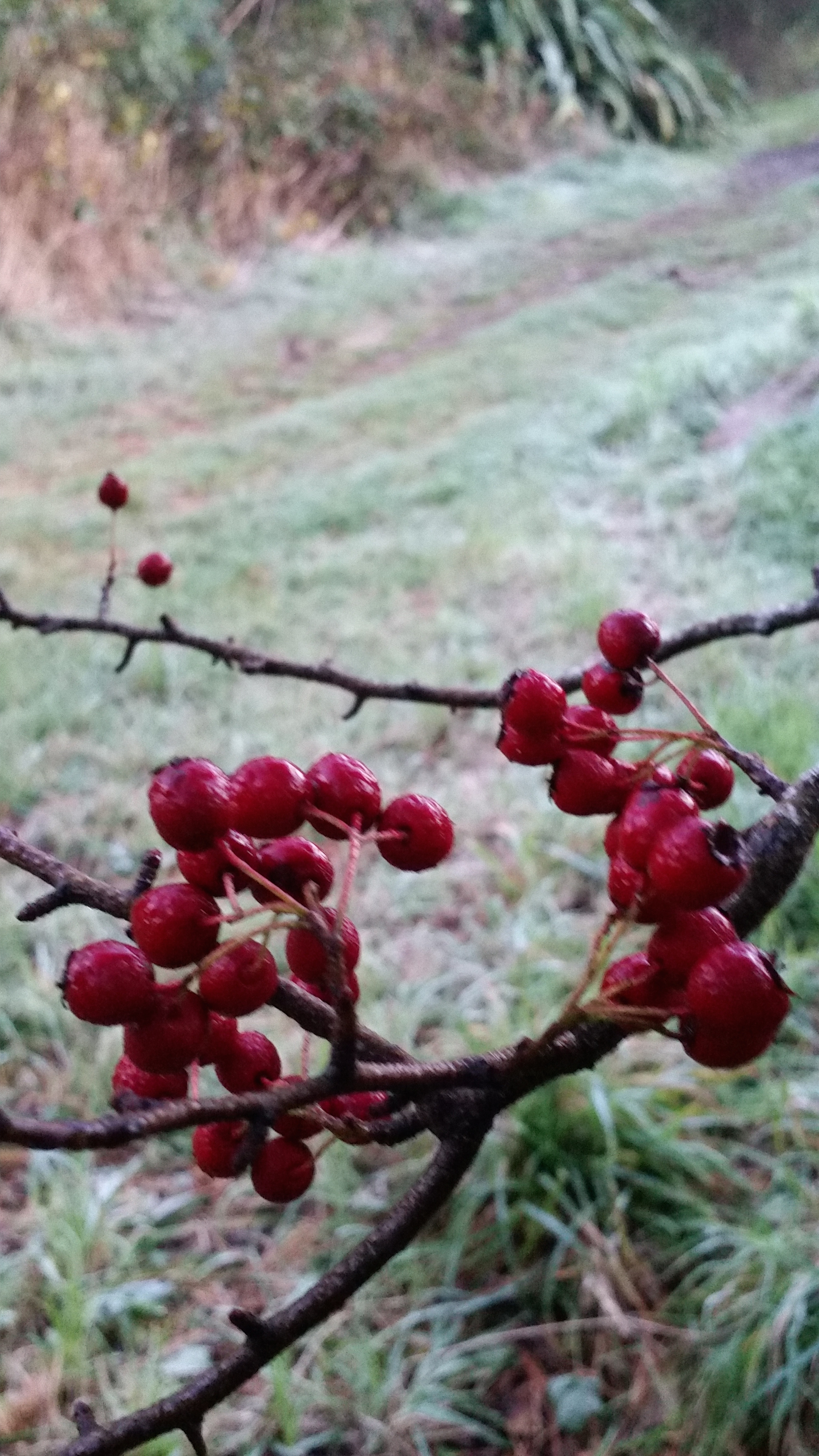 Three decades later, here we are again harvesting haws. On our land we have many Hawthorns to choose from but I had my eye on a young tree on the exposed hilltop overlooking our house (as pictured above). Wal volunteered to do the harvesting braving the mean southerly.